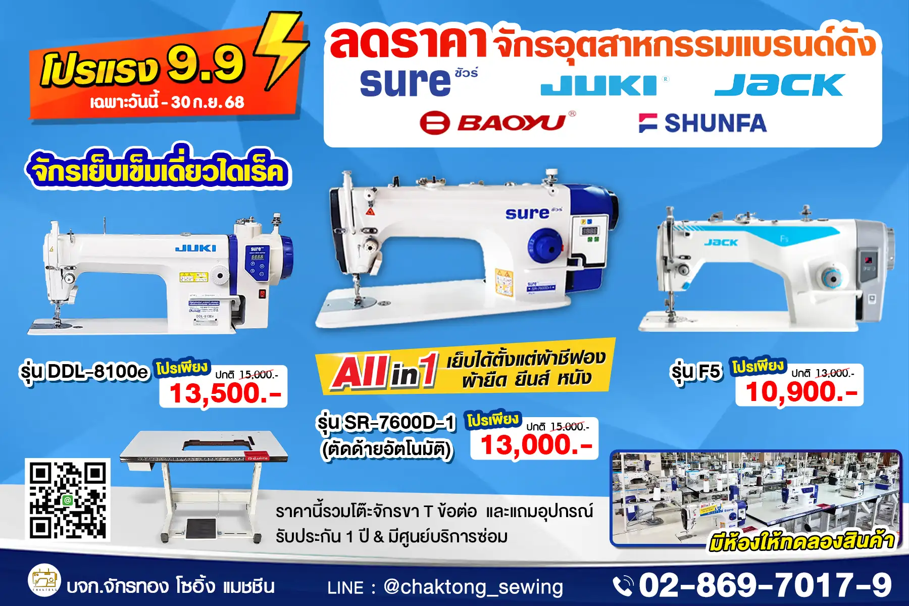 โปรแรง 9.9 ลดราคาจักรเย็บผ้าอุตสาหกรรมแบรนด์ดัง โปรแรง 9.9 เซตเตารีดมืออาชีพ ✅ เตารีดไอน้ำกระปุกน้ำเกลือ ✅ เตารีดไอน้ำหม้อต้ม ✅ เตารีดไอน้ำแบบทับ ✅ โต๊ะรองรีดลมดูดมีฮีทเตอร์ ส่วนลดพิเศษ !! จักรเย็บผ้าซิกแซก (กระเป๋าหิ้ว) DRAGONFLY DF-1818, DF-1824 ส่วนลดพิเศษ !! จักรเจาะรังกระดุมคอม ฯ เสื้อยืด (มือสอง) JUKI รุ่น LBH-1700 มือสองสภาพเหมือนใหม่ 95% ส่วนลดพิเศษ !! จักรลาเจียรซ้ายฐานเต็ม ระบบลม SUNSTAR SC7310-M156G/S ส่วนลดพิเศษ !! จักรเย็บคอมฯเข็มเดี่ยว ไดเร็ค SUNSTAR รุ่น KM-2300SG ส่วนลดพิเศษ !! จักรเย็บเข็มเดี่ยว SUNSTAR KM-250AL ส่วนลดพิเศษ !! จักรเย็บคอมฯ เข็มเดี่ยว SUNSTAR KM-250AL-7S